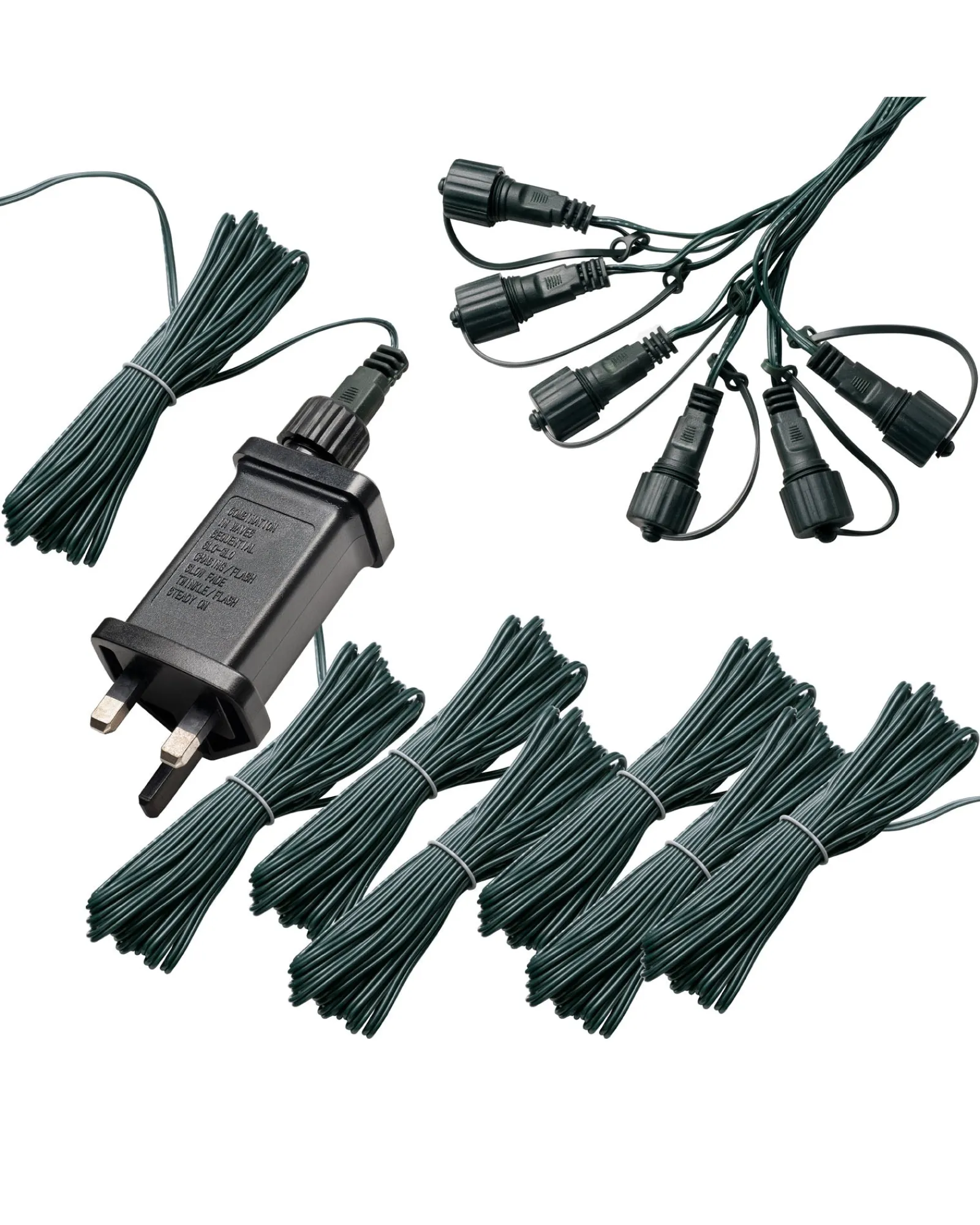 Combine with up to 3,500 LEDs from WeRChristmas’ connectable lights range to brighten up your festive season using this medium sized transformer. Simply plug in to the mains and connect with the LED lights using the easy-to-attach male/female connector. This transformer comes with a 6 m lead wire in dark green making it easy to start your decoration display inside or outside of your home.