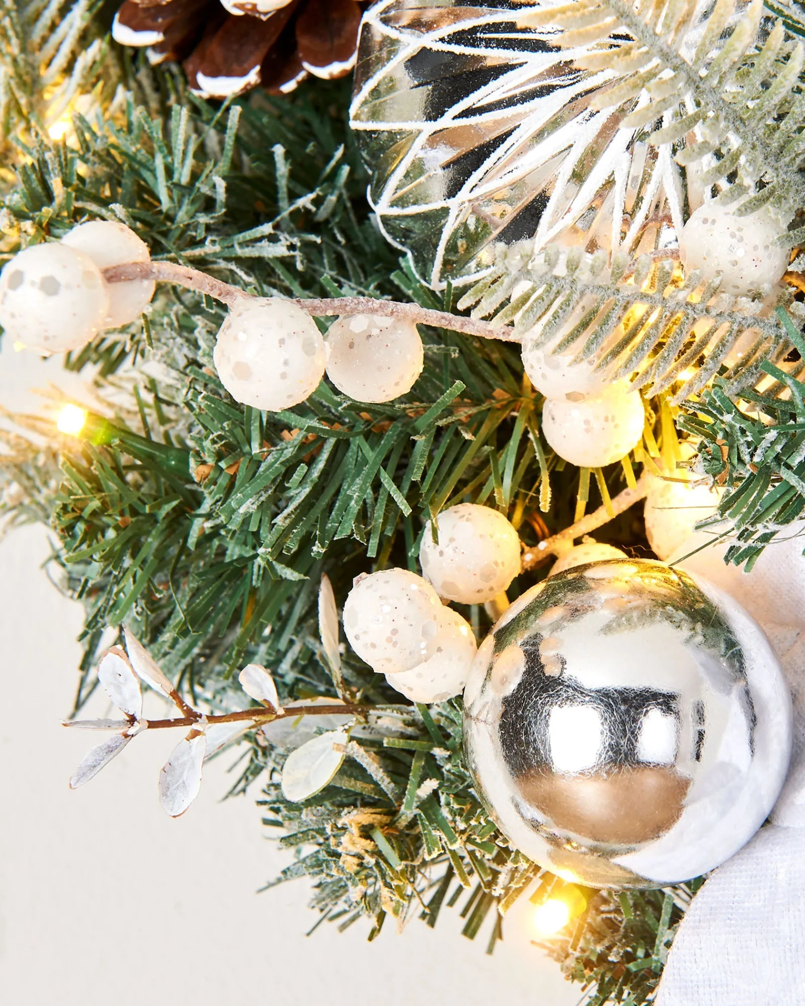 Painstakingly crafted, it boasts a lavish assembly of white and silver foliage, creating a refined backdrop. Varied baubles shimmer subtly, infusing the design with glamour, while sprigs of berries introduce pops of colour and texture. Realistic pine cones, nestled amidst the foliage, evoke a sense of rustic charm.