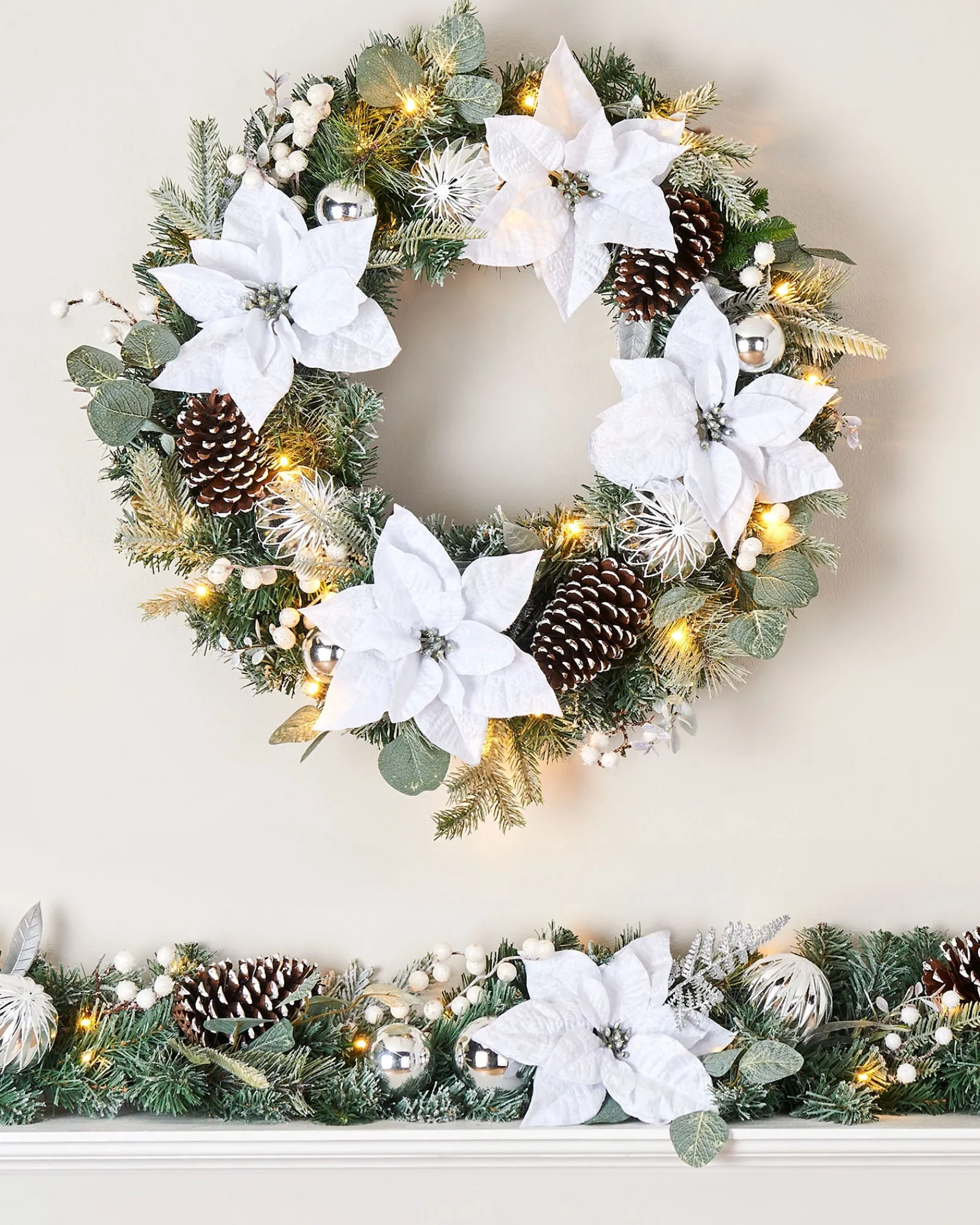 Enhance the festive spirit of your home with our Pre-Lit Decorated Wreath in White/Silver. Marrying timeless elegance with contemporary flair, this wreath is set to be a centrepiece, whether adorning a door, window, or wall.
