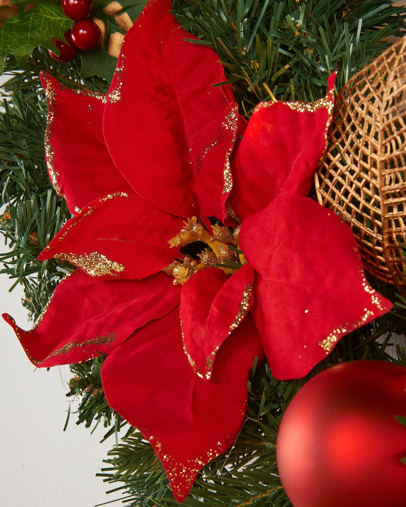 The foundation of the wreath is made from durable branches, thoughtfully arranged to craft a circular frame. This provides a solid base for the opulent decorations. Amongst the branches, you’ll find a selection of gleaming baubles, delicate flowers, and radiant leaves. Each of these elements has been chosen with care to present a harmonious fusion of textures and hues.