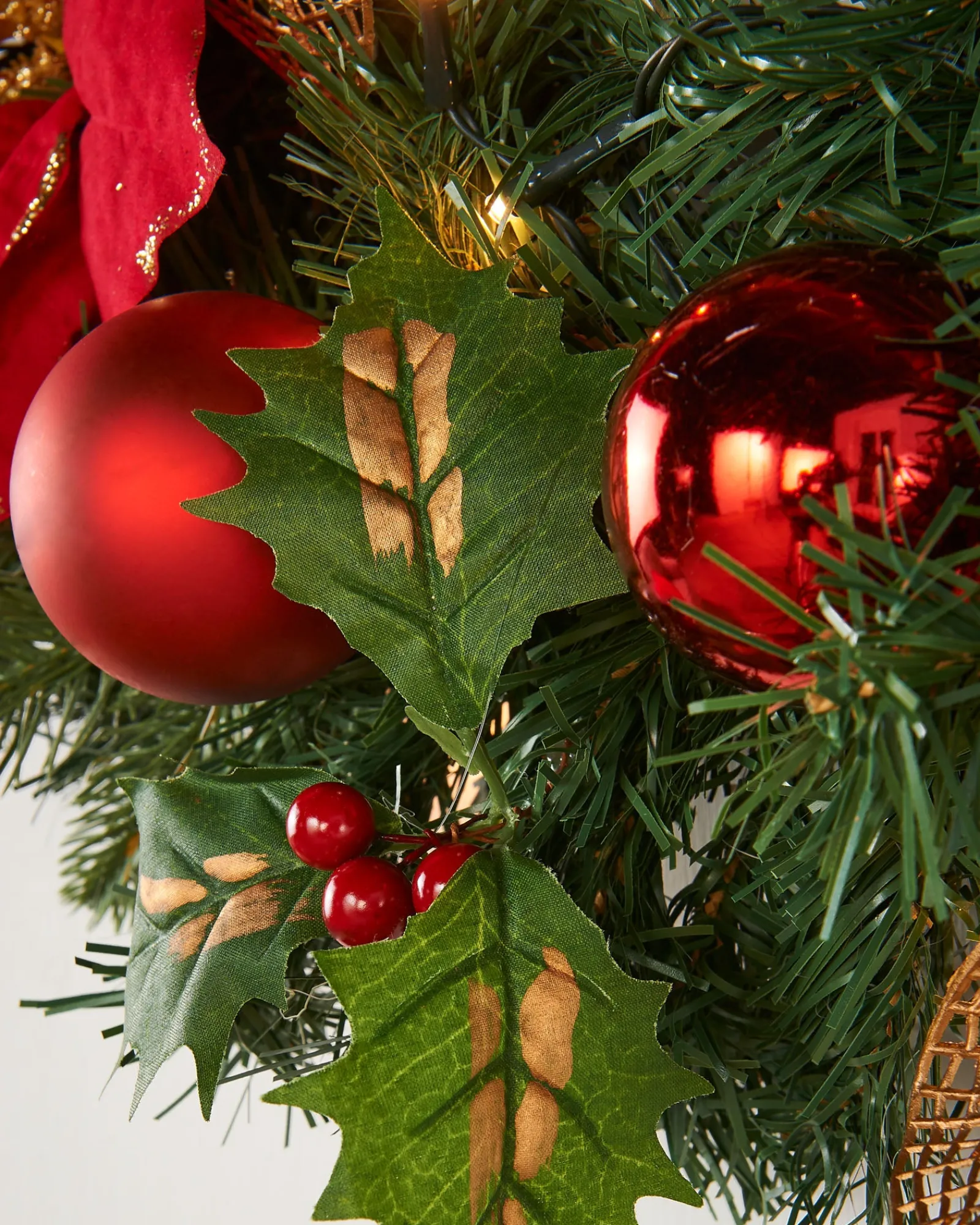 Elevating the wreath’s allure are 20 Warm White LED lights, gracefully woven amidst the ornaments. Casting a soft and welcoming glow, these lights establish a warm ambiance that’s sure to enhance the festive atmosphere of your home. (Do note, the lights are powered by 2xAA batteries, which are not included.)
