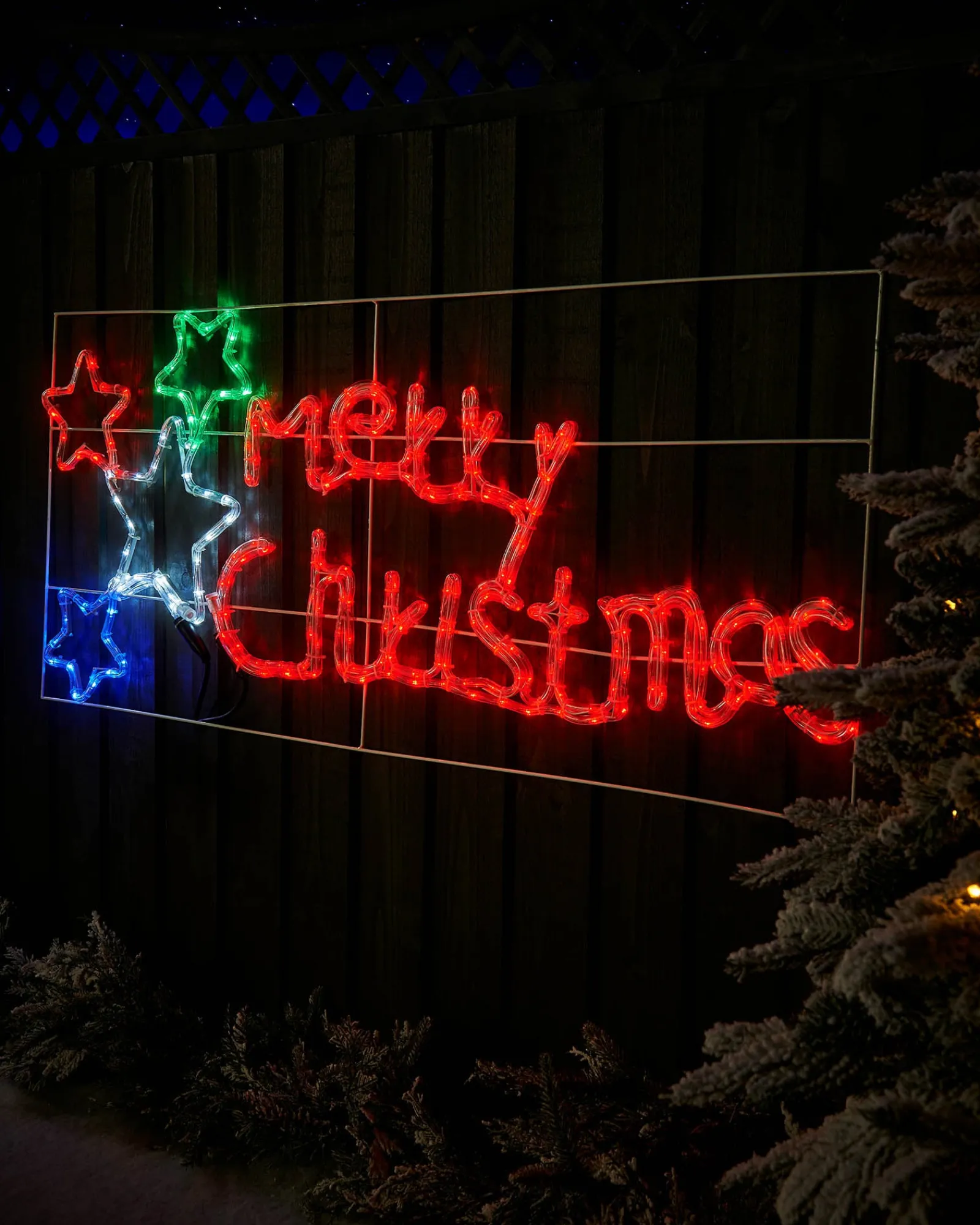 Dazzle guests this Christmas with our Pre-Lit Merry Christmas Rope Light Silhouette. This eye-catching decoration features the words “Merry Christmas” illuminated with multi-coloured LED lights, with blue, green, bright white and red.
