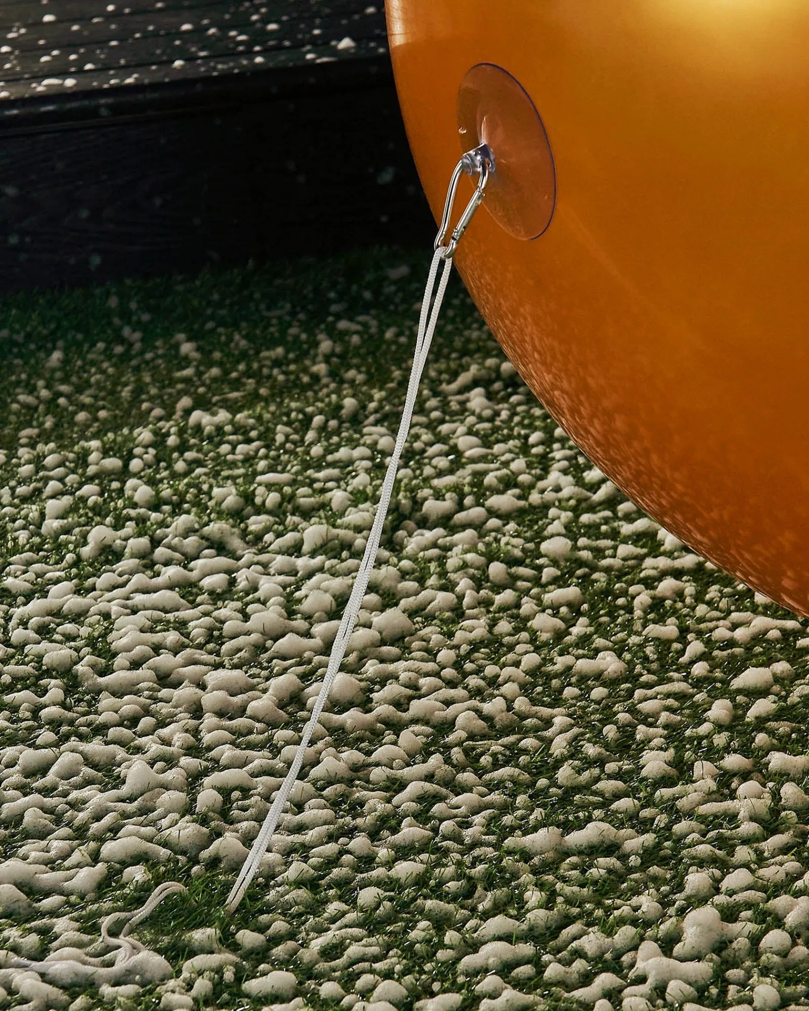 This set is comprehensive and includes everything needed for setup and display. A handy air pump allows for quick inflation, while a suction cap with a steel buckle offers alternative hanging solutions. The set also includes a white hanging rope, which attaches to the buckle, forming a loop for easy adjustment and placement. For secure outdoor installation, a plastic stake is provided, ensuring the bauble stays grounded.