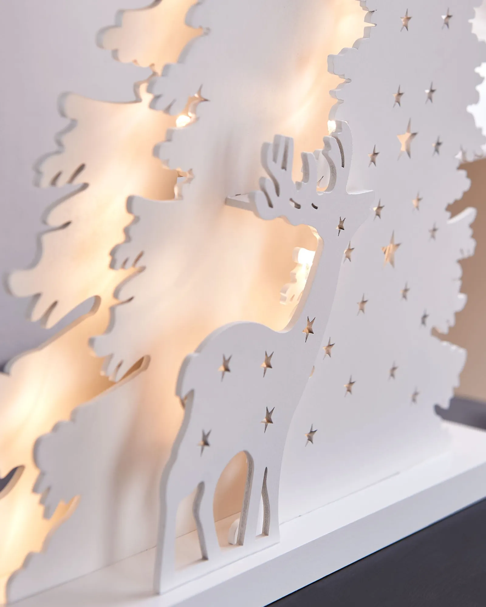 Create a warm and inviting atmosphere in your home this festive season with this enchanting Pre-Lit Wooden Reindeer Scene. This beautiful scene features a reindeer standing in front of snowy trees, all pre-lit with 30 Warm White LED lights. The scene is also crafted from white painted high-quality wood, ensuring that it will last for years to come.