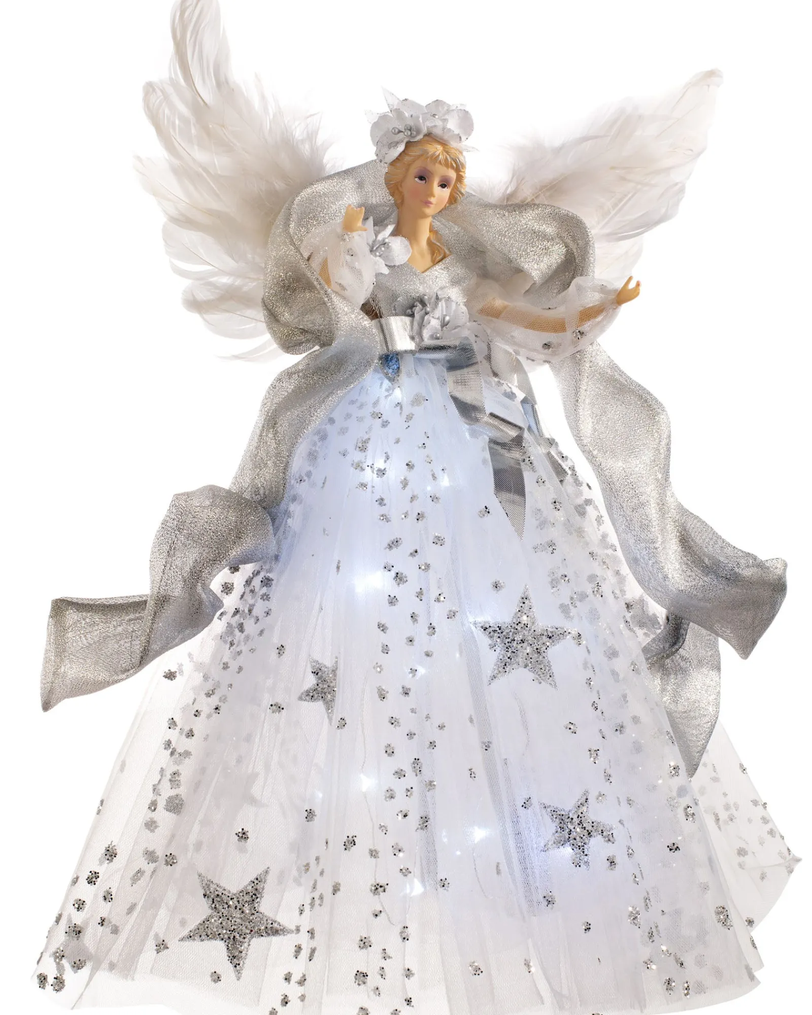 This exquisite topper features a graceful angel figure with outstretched fur wings, draped in a flowing metallic silver dress which has sheer netting and features a silver glitter star pattern.