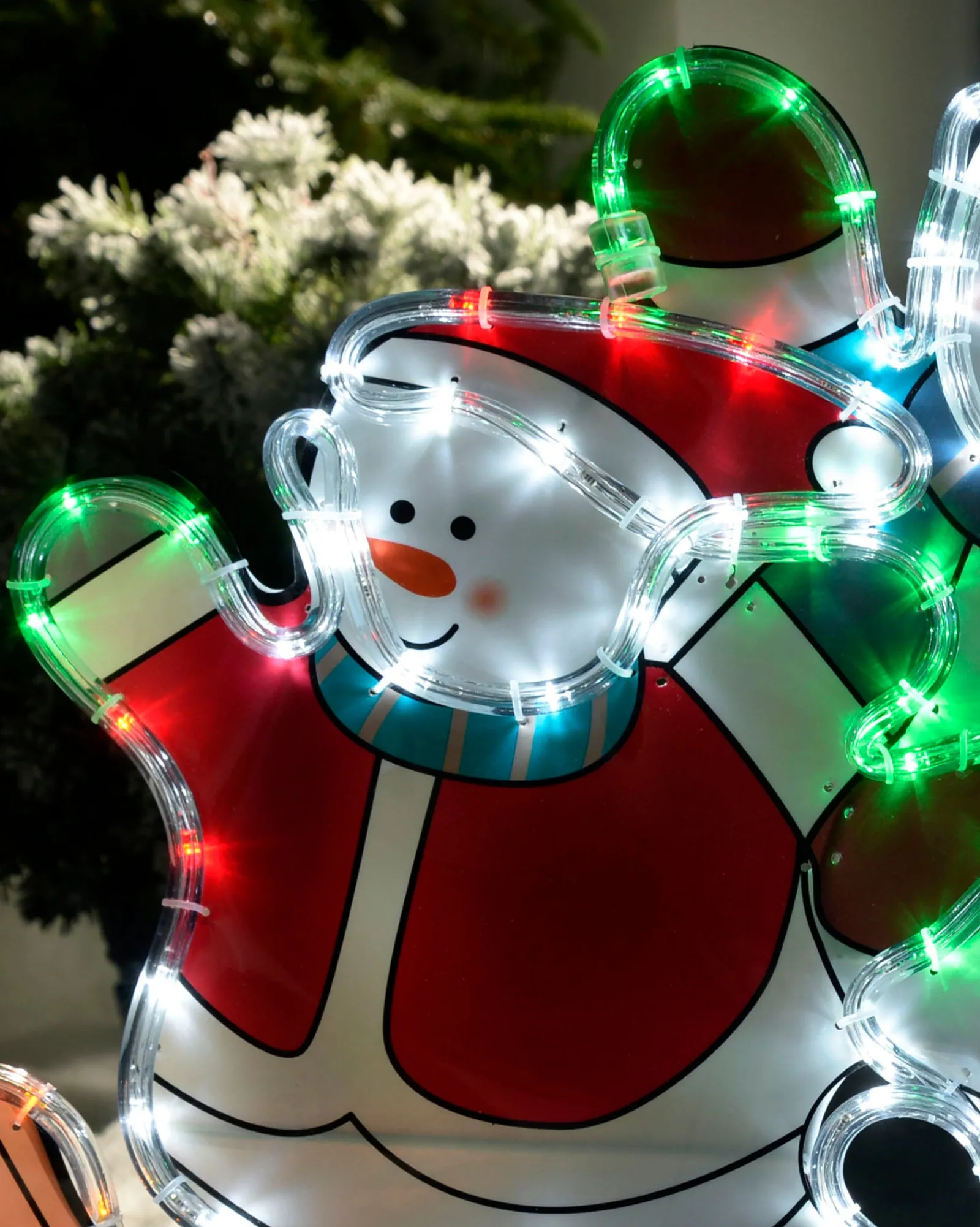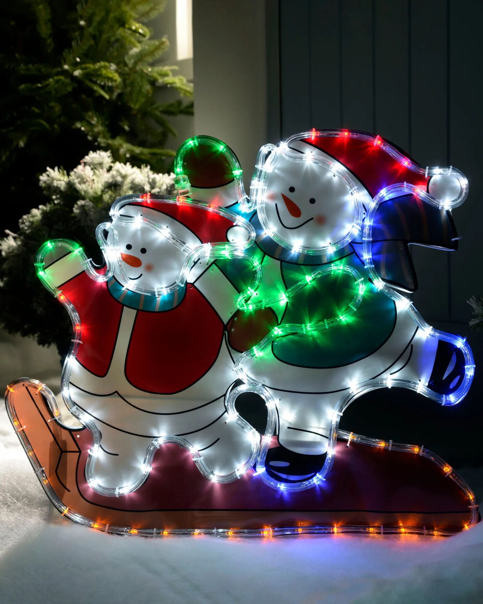 Bring the joy of winter to your home with this enchanting Skating Snowmen Rope Light Silhouette. Two cheerful snowmen skate hand-in-hand, their multi-coloured LED lights twinkling merrily in the night sky.