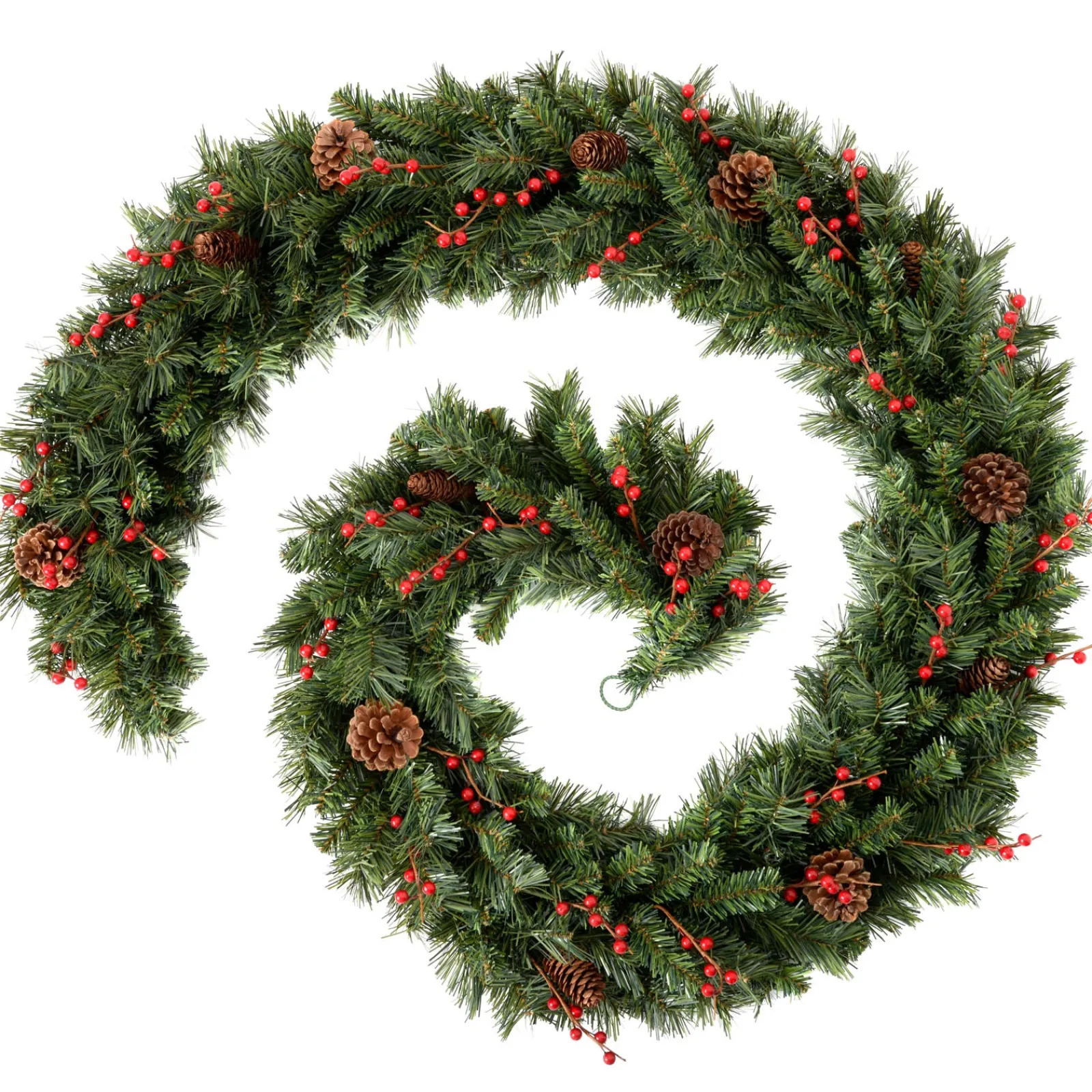 Elevate the festive atmosphere of your interiors with this exquisite 9-foot mixed pine decorated garland. Meticulously designed, it artfully combines 12 rustic pine cones and 32 vibrant sets of berries amidst the lush greenery of the PVC material. With its 260 PVC tips, the garland boasts a luxuriously full and bushy appearance, making it especially fitting for adorning expansive spaces within your home.
