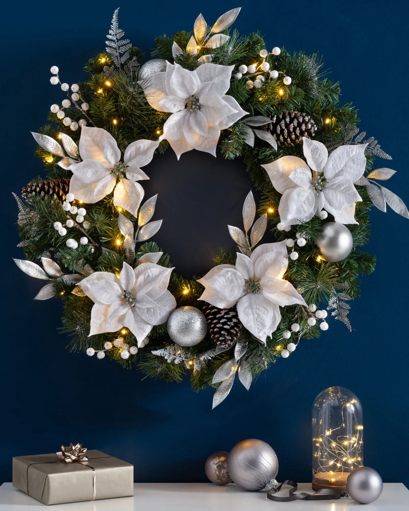 WeRChristmas Decorated Wreaths|Pre Lit Wreaths^Pre-Lit Extra Thick Wreath, Silver/White, 76 Cm