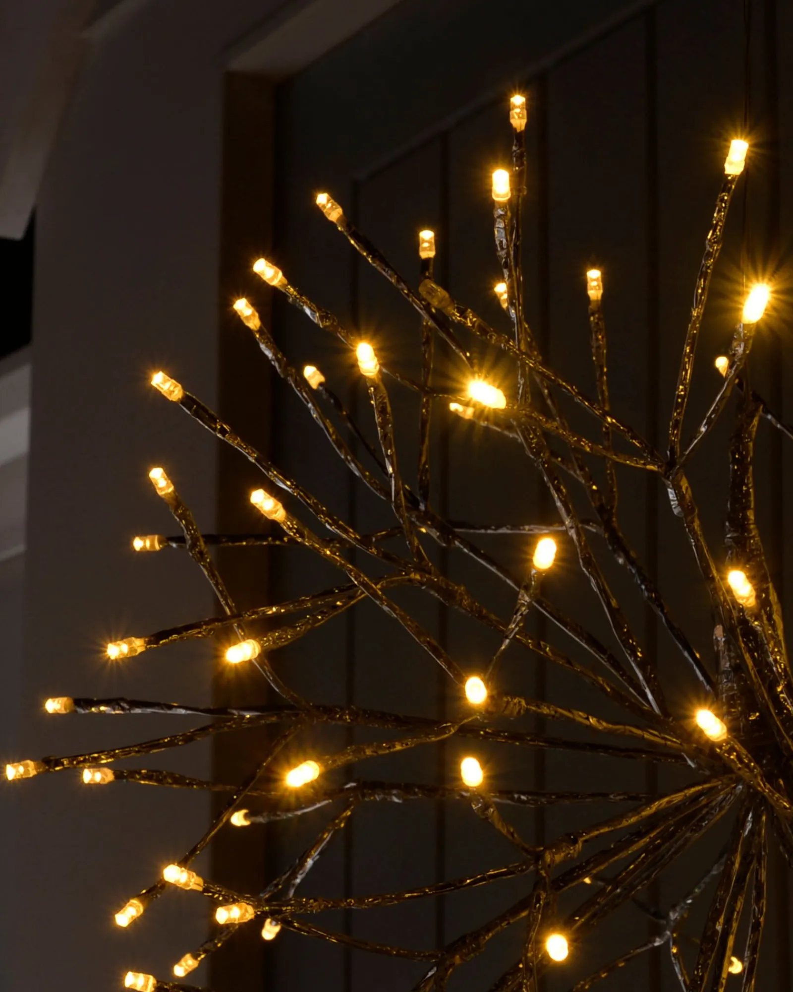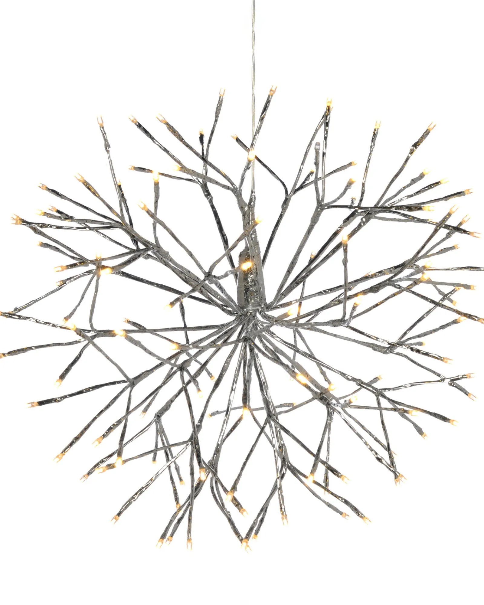 This light up hanging silver branch is a great way to add some light to your garden or home. It features 12 flexible branches wrapped in a silver material. Each branch contains 4 Warm White LED lights which can also be moved. These branches are flexible allowing you to create multiple designs.This branch ball comes with a hanging hoop allowing you to hang this easily at various heights. It can be used both inside and outside ideal for Christmas or as a garden light throughout the year.The lead cable measures 5 metres and the overall diameter measures at 50 cm allowing you to use this in a variety of places. Thanks to the flexible design, this decoration is very easy to store when not in use. Please ensure that you use a waterproof socket for the transformer if used outdoors.