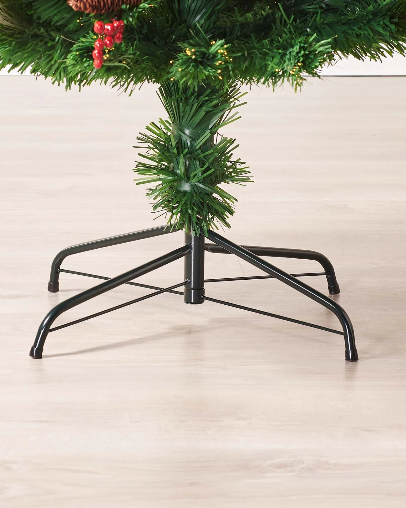 Integrated within the lush greenery are 328 warm white LEDs, which cast a serene, ambient glow throughout the room. Their gentle illumination beautifully complements the natural appearance of the tree, with its berries and pinecones artfully adorned amidst the branches. Furthermore, sprinkled throughout are delicate micro LED stars, twinkling softly, reminiscent of a starry night sky.