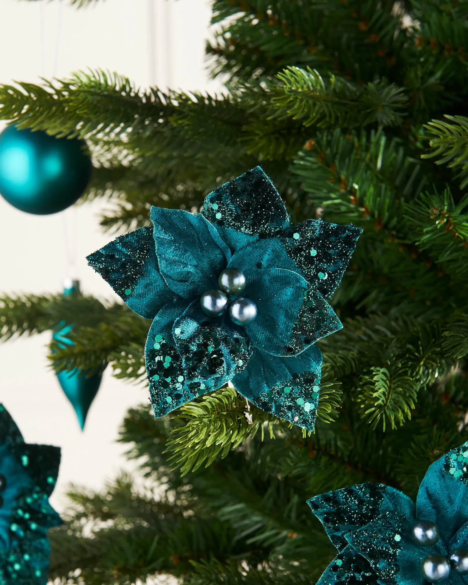 Add floral beauty to your Christmas display with this set of 3 festive flower decoration, featuring an Artificial Emerald Poinsettia design.Slide the flowers into the branches of your Christmas tree to add this beautiful emerald poinsettia decoration and fan out the leaves to your liking by simply adjusting their flexible wire edges. This artificial Christmas flower decoration looks excellent anywhere around the home and is diligently designed to look as realistic as possible, with added sequence and glitter to provide the finishing touches.Bring the magic of Christmas home with this enchanting Artificial Emerald Poinsettia Flowers.