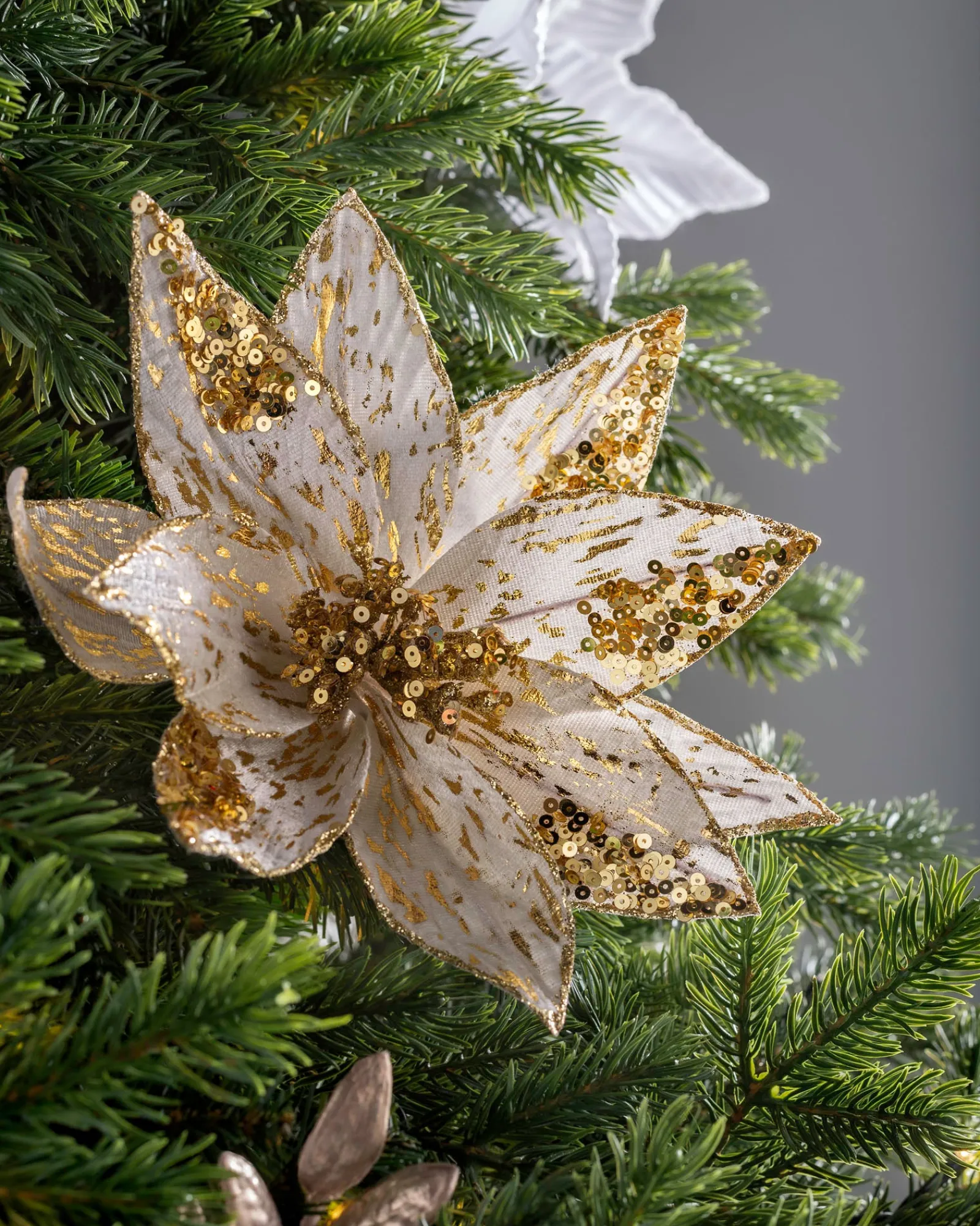 Slide the flower stem into the branches of your Christmas tree to add this beautiful golden poinsettia decoration and fan out the leaves to your liking by simply adjusting their flexible wire edges. This artificial Christmas flower decoration looks excellent anywhere around the home and is diligently designed to look as realistic as possible, with added sequence and glitter to provide the finishing touches.