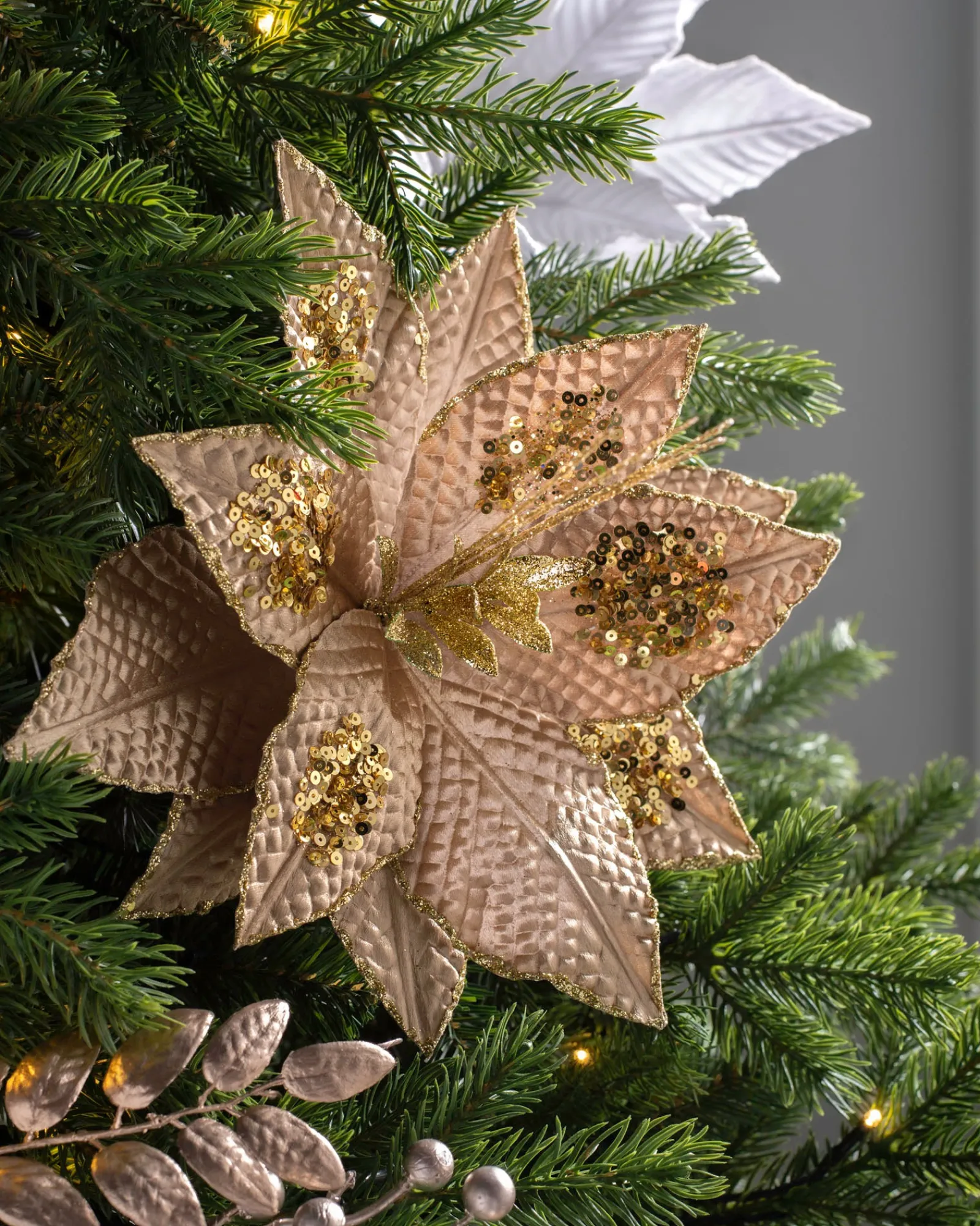 Bring the magic of Christmas home with this enchanting Artificial Poinsettia Gold Flower.