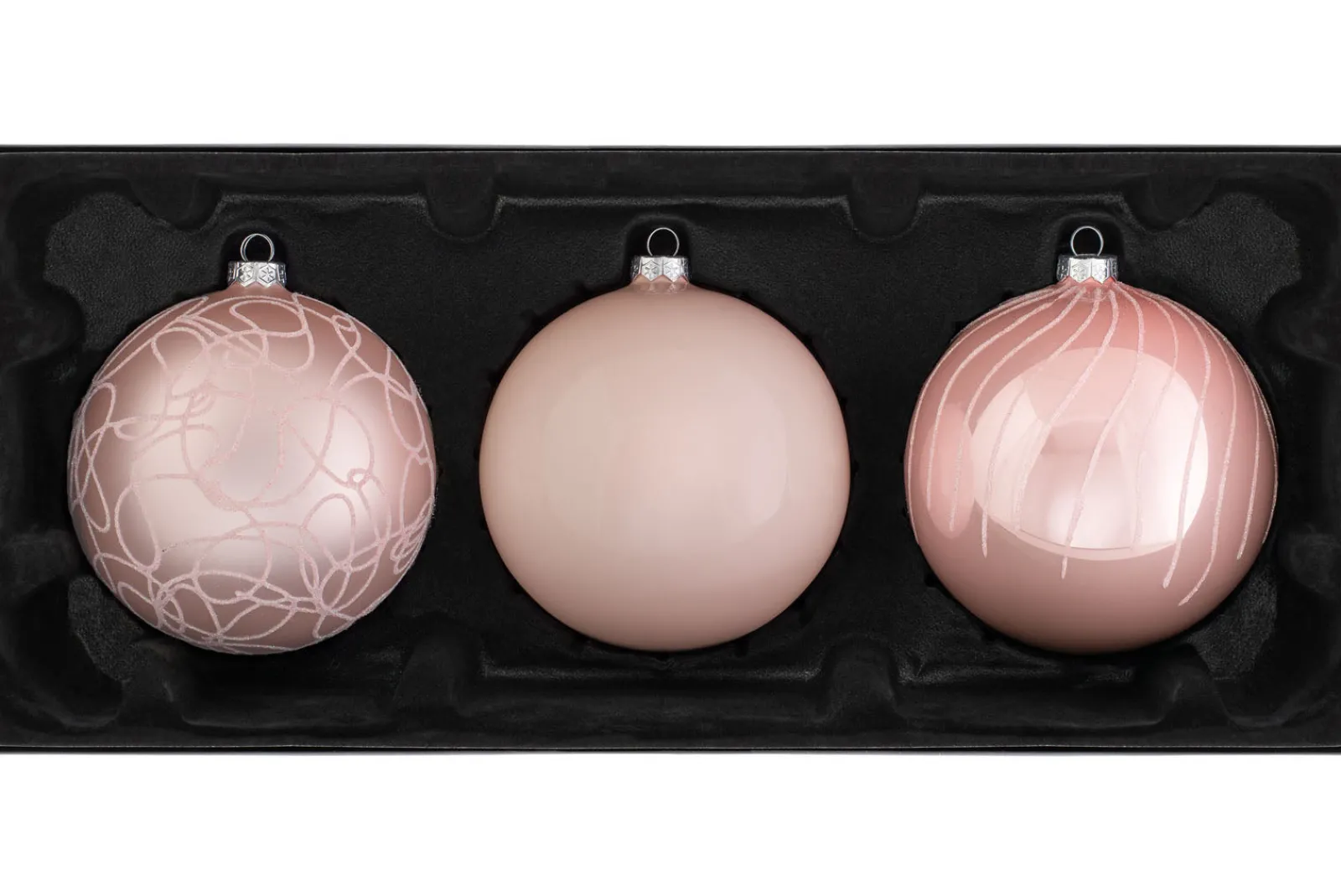 Elevate your Christmas aesthetic with a trio of exquisitely chosen Baby Pink glass baubles, each standing at 13 cm. These baubles come alive with a harmonious blend of glossy and matte textures, complemented by delicate glitter embellishments for a sparkling finish.