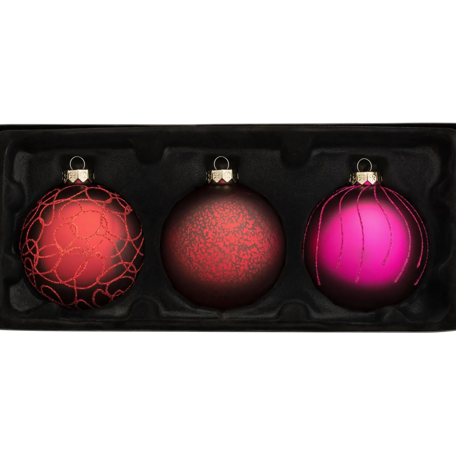 Brighten up your home this Christmas with our 3 exquisite Ruby traditional glass baubles, each hand-selected to bring a splash of colour to your seasonal decor. The set features a range of textures – from a captivating shine to an understated matte, and a richly mottled pattern, all adorned with sparkling glitter finishes.