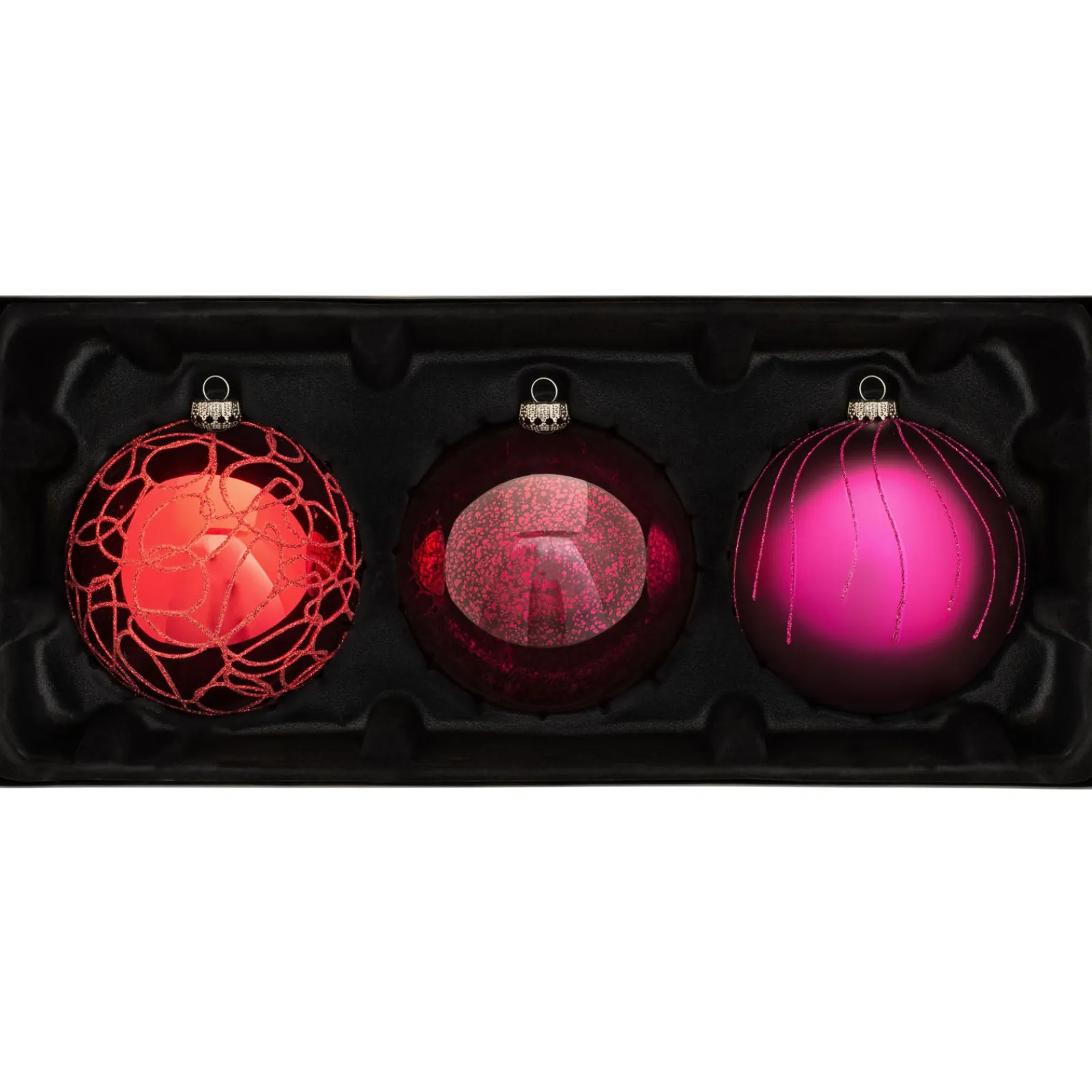 Infuse your festive décor with the vibrant allure of our set of 3 handpicked Ruby glass baubles, each boasting an alluring combination of finishes. Discover the reflective sheen, the velvety matte, and the textured mottled effect, each bauble kissed with a dusting of glitter for that festive twinkle.