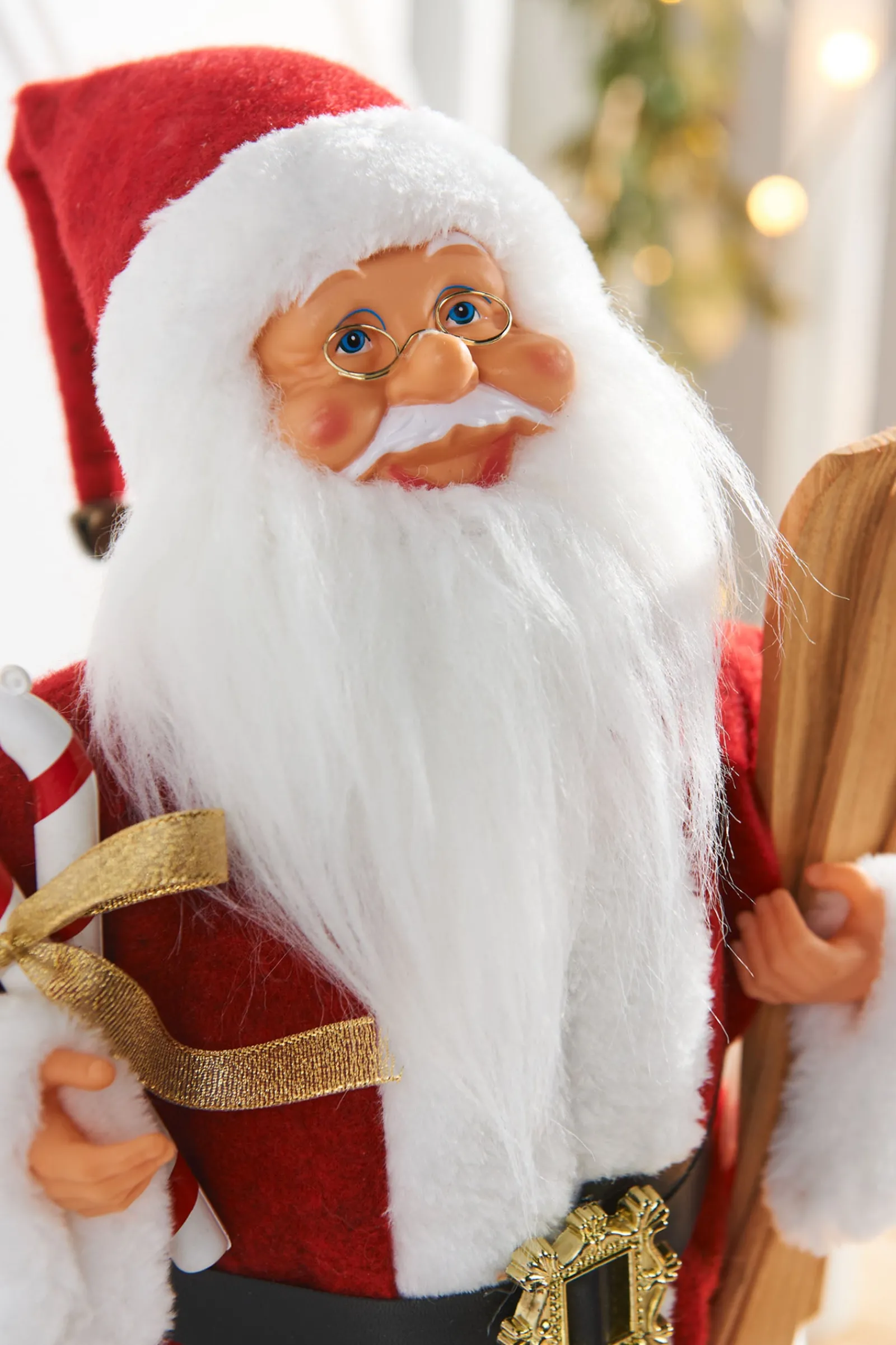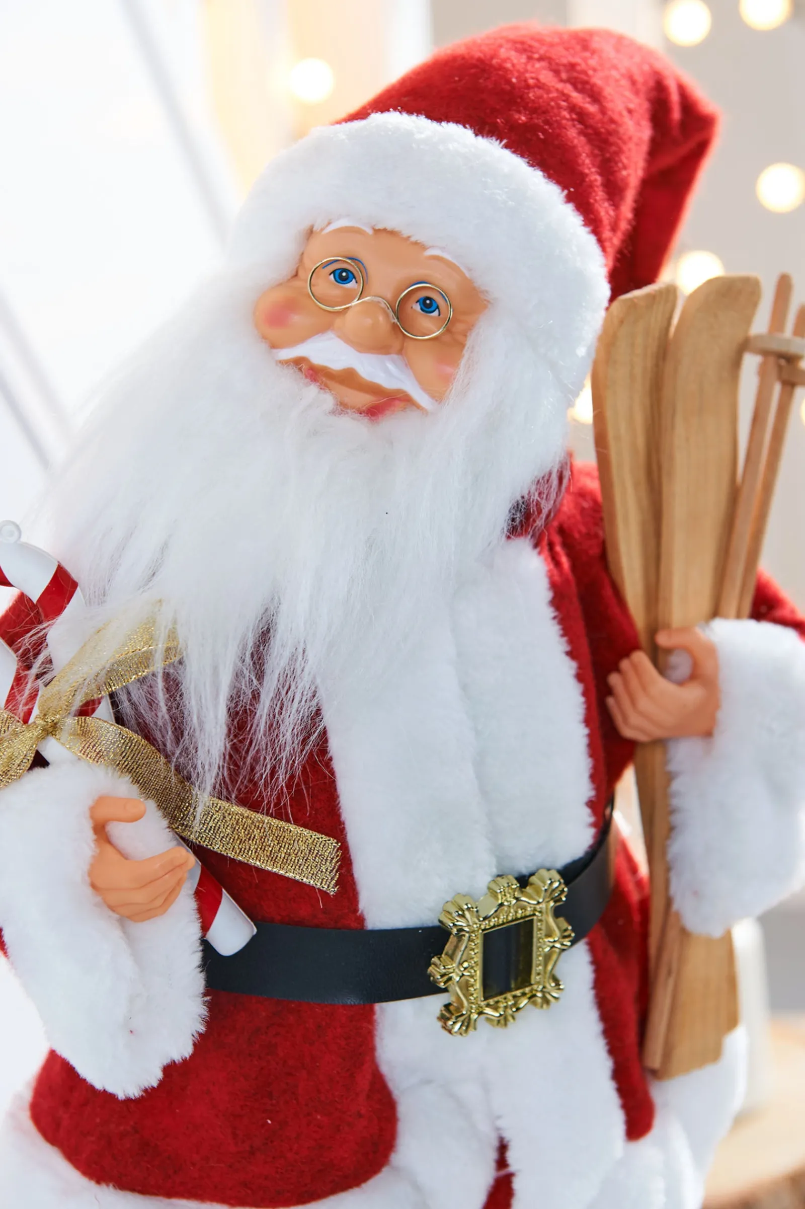 Clad in his iconic red suit trimmed with white fur and sporting rounded spectacles, Santa Claus stands ready for wintry adventures, complete with wooden skis and a cluster of candy canes adorned with bows.
