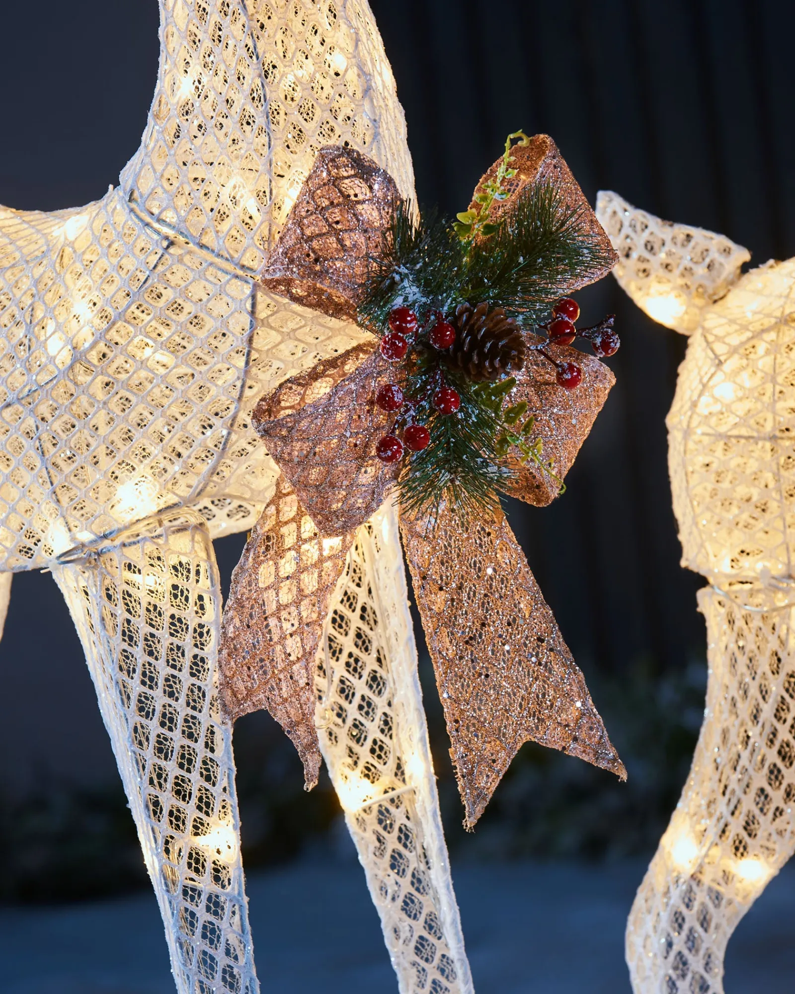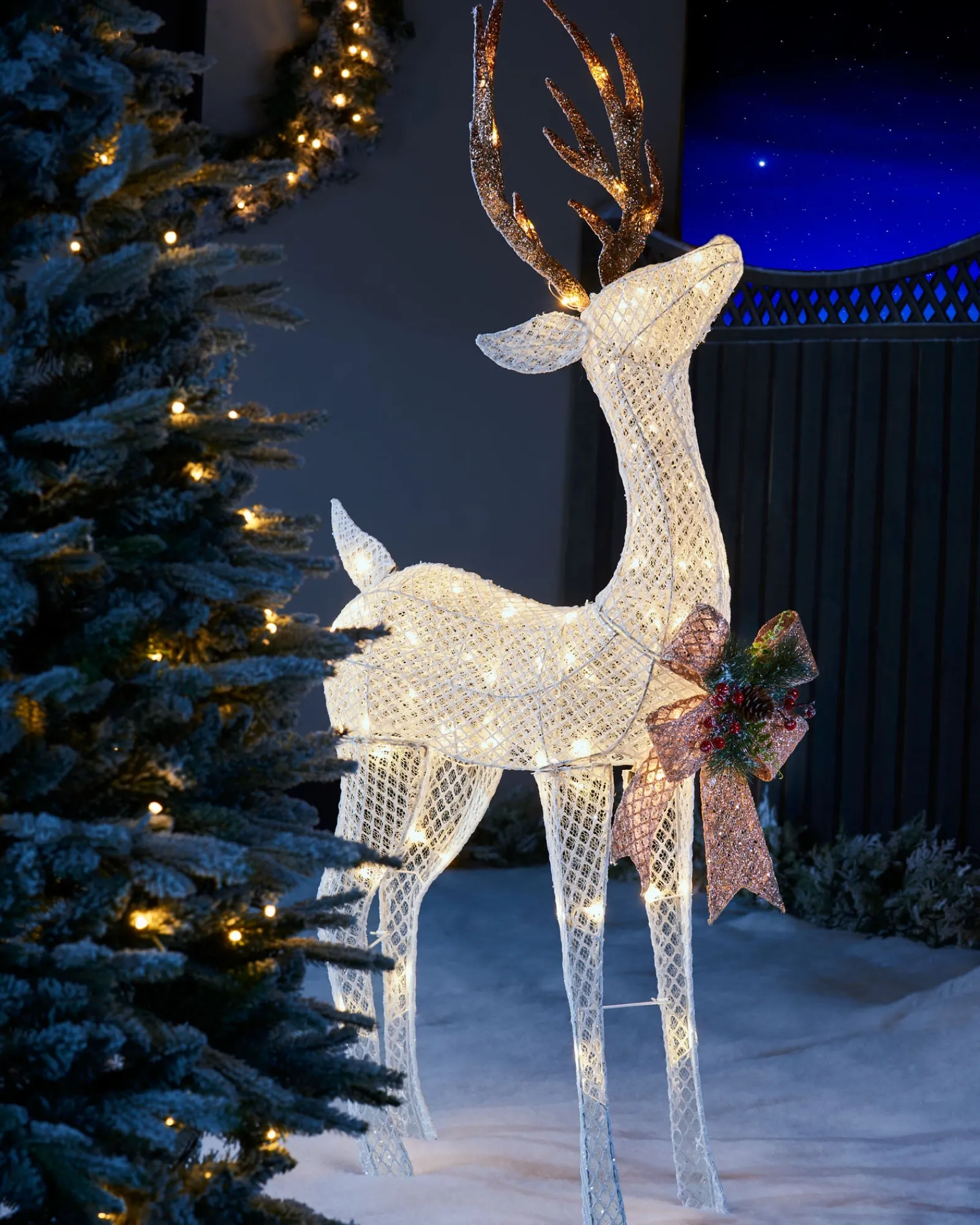 Bring the magic of nature to your home or garden with this stunning 3D Reindeer Family Silhouette. This life-size decoration features a standing stag and grazing doe illuminated by 160 warm white LED lights, each reindeer has 80 LED lights.