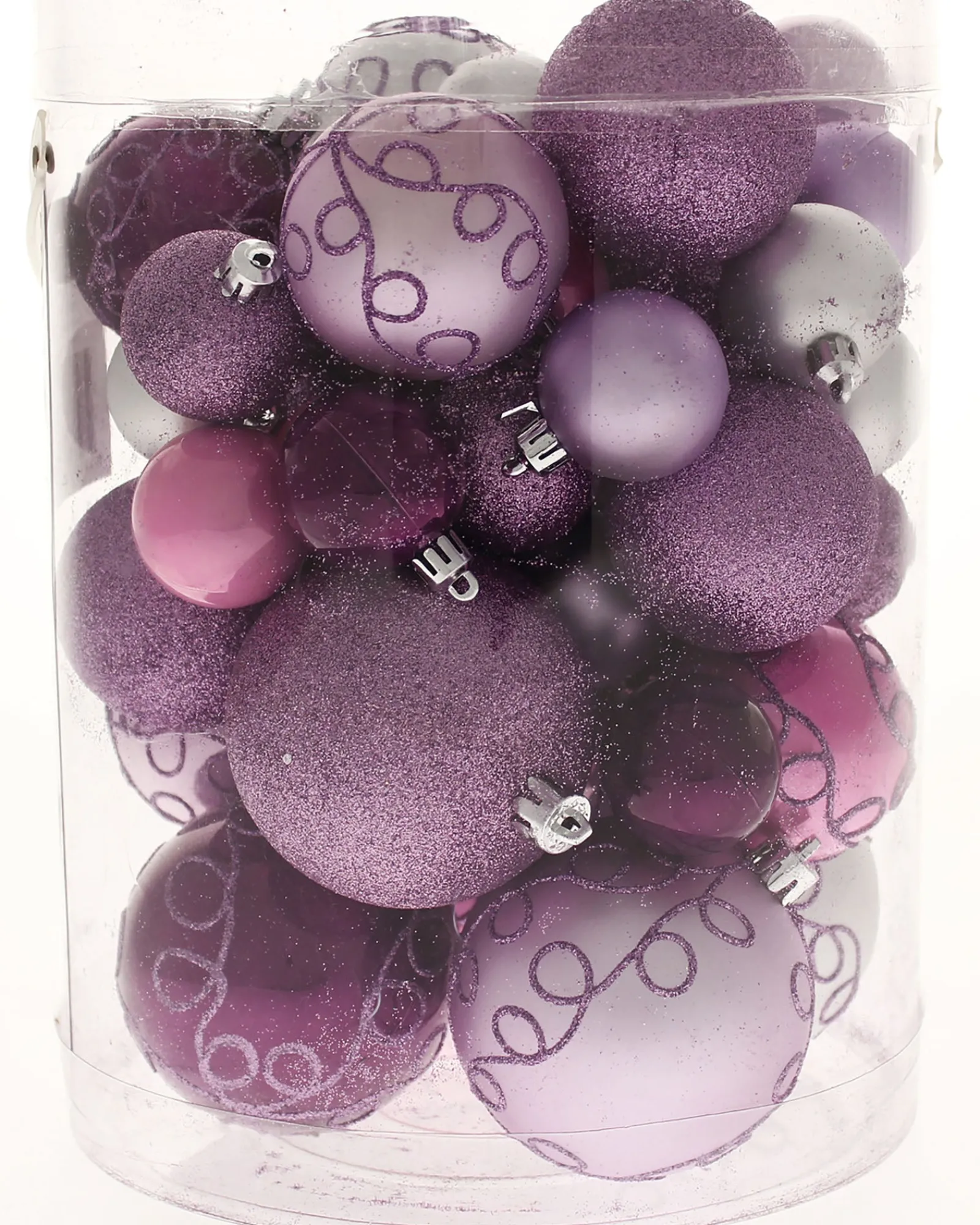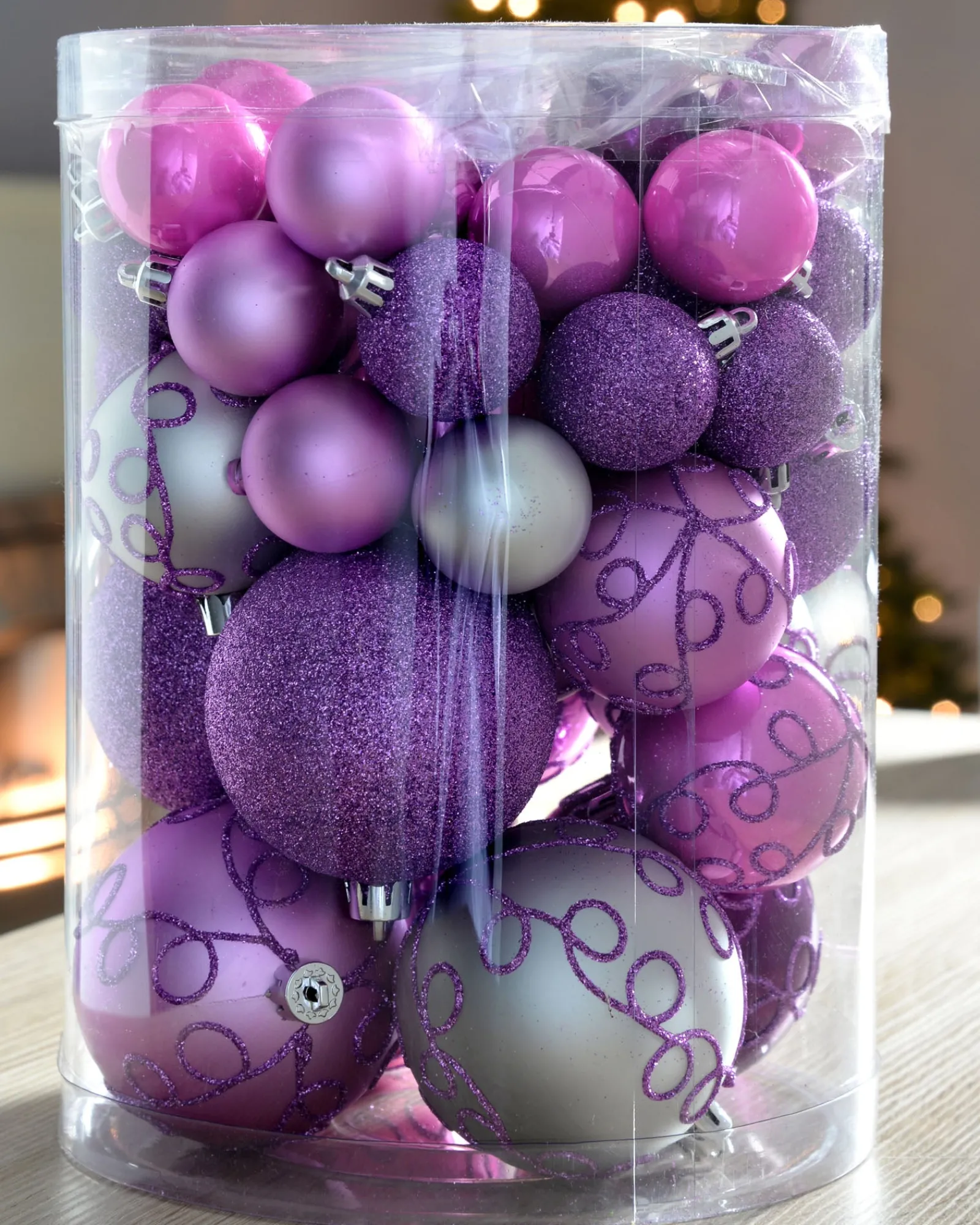 Introducing our stunning Lilac Shatterproof Baubles, available in a generous pack of 50 to adorn your indoor space with timeless elegance. This comprehensive set offers a versatile assortment of baubles, each carefully designed to add a touch of sophistication to your décor. In this pack, you’ll find a harmonious blend of pearlized, matt, shiny, and glitter finishes, allowing you to create the perfect look that suits your style and vision. The variety of textures and shades of Lilac ensure that your interior décor captures a subtle, classic charm while maintaining durability.Each bauble in this set is expertly crafted to be shatterproof, providing both safety and peace of mind. You can hang them with confidence on your Christmas tree. Timeless Elegance, Effortless Brilliance: 50-Pack Lilac Shatterproof Baubles!