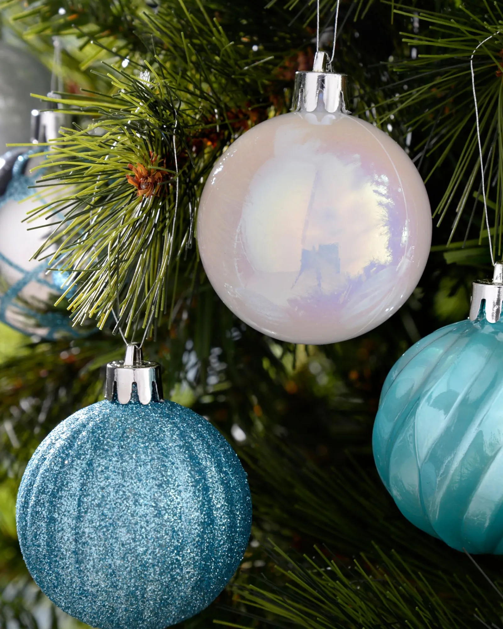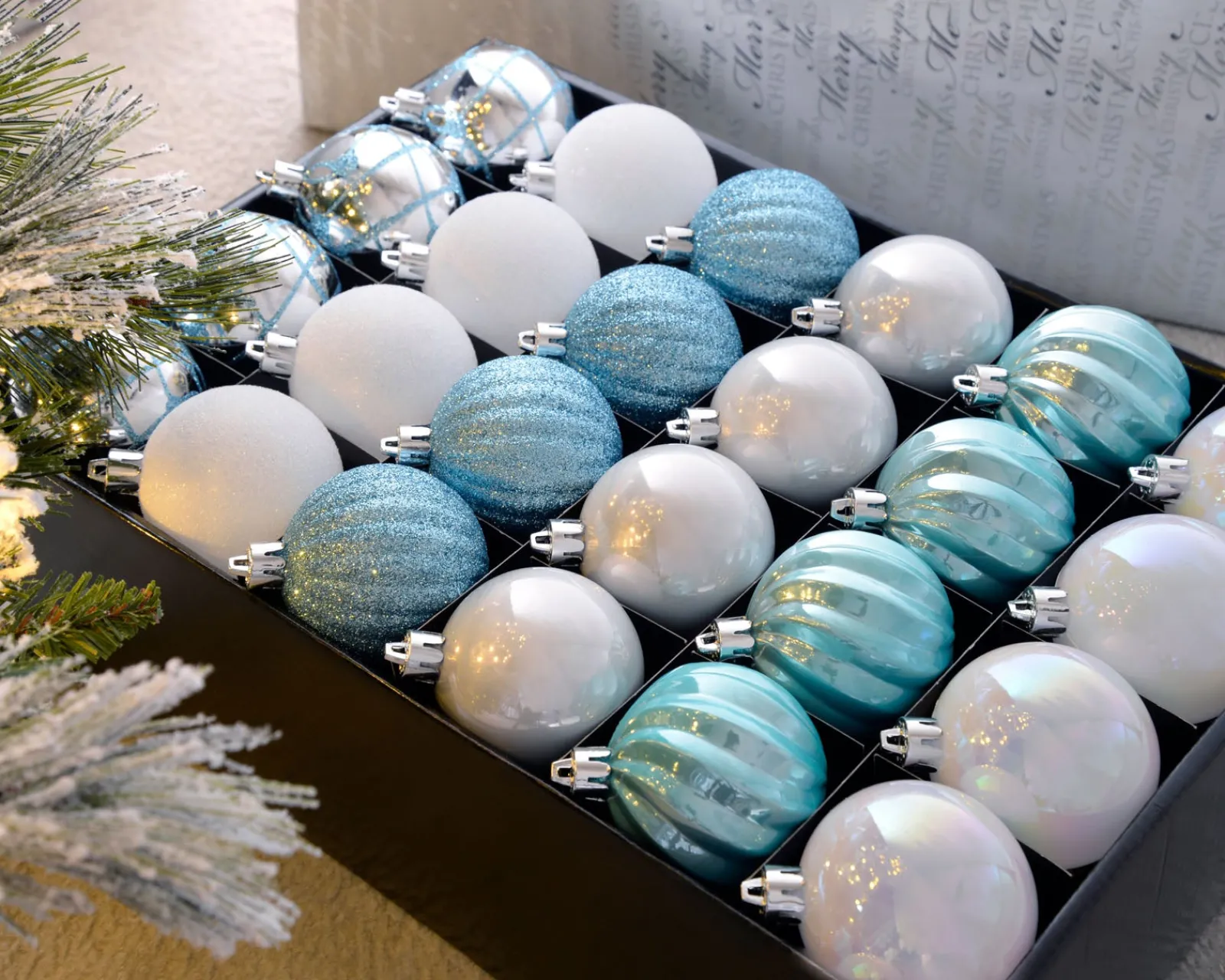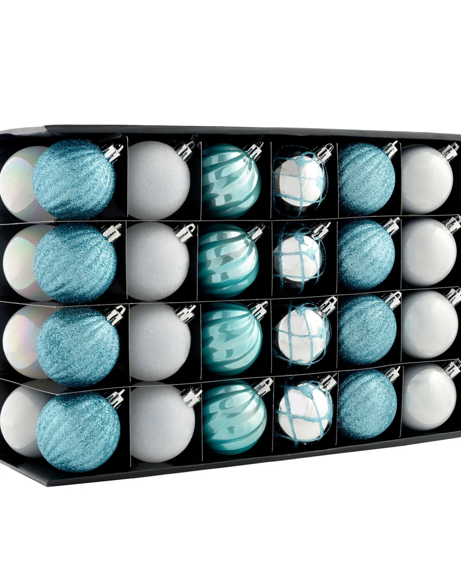 Unveil the enchantment of the festive season with the 48-Piece Shatterproof Luxury Christmas Tree Baubles in a captivating palette of white and blue hues, an exquisite collection destined to transform your festive décor into a symphony of elegance and timeless charm.