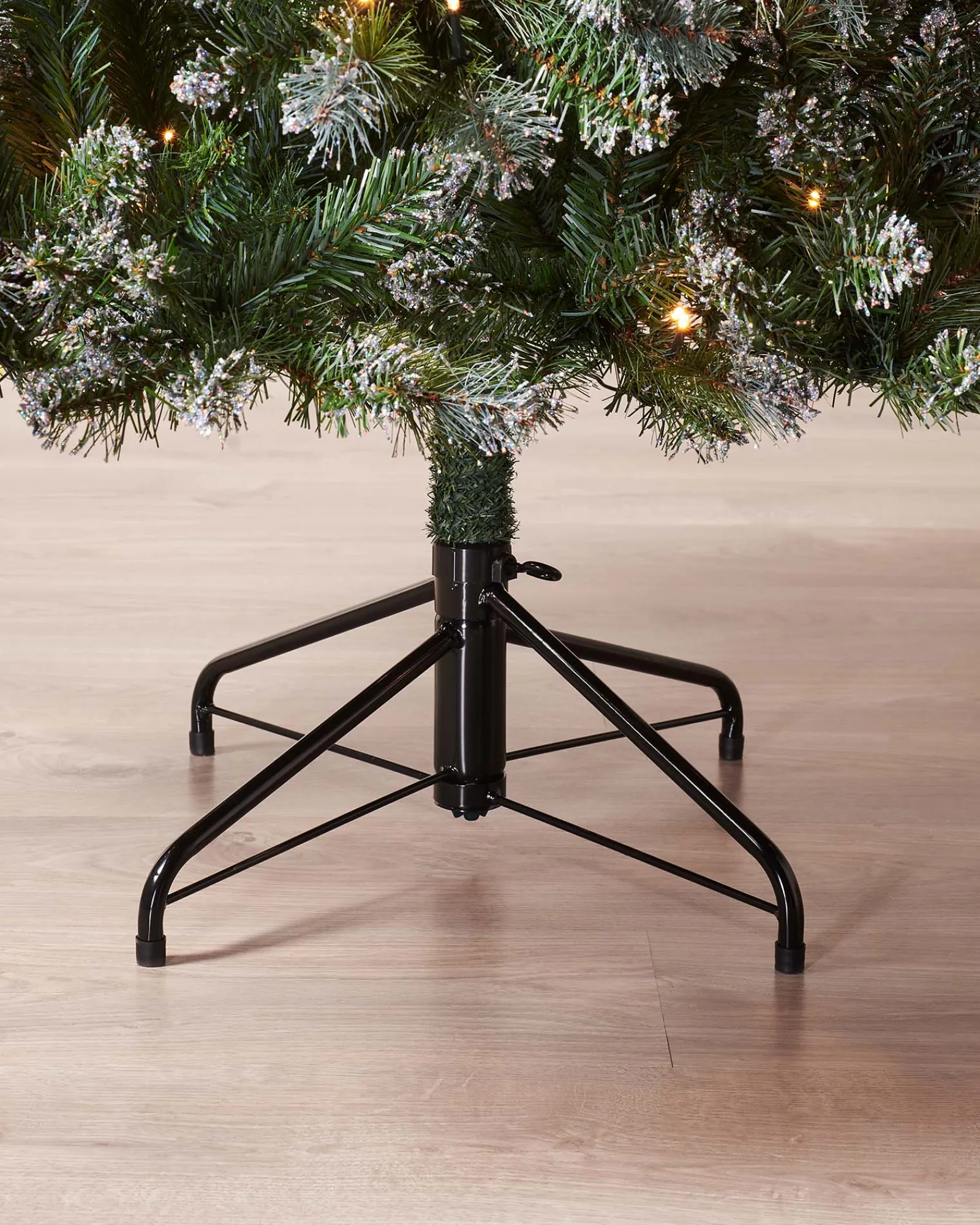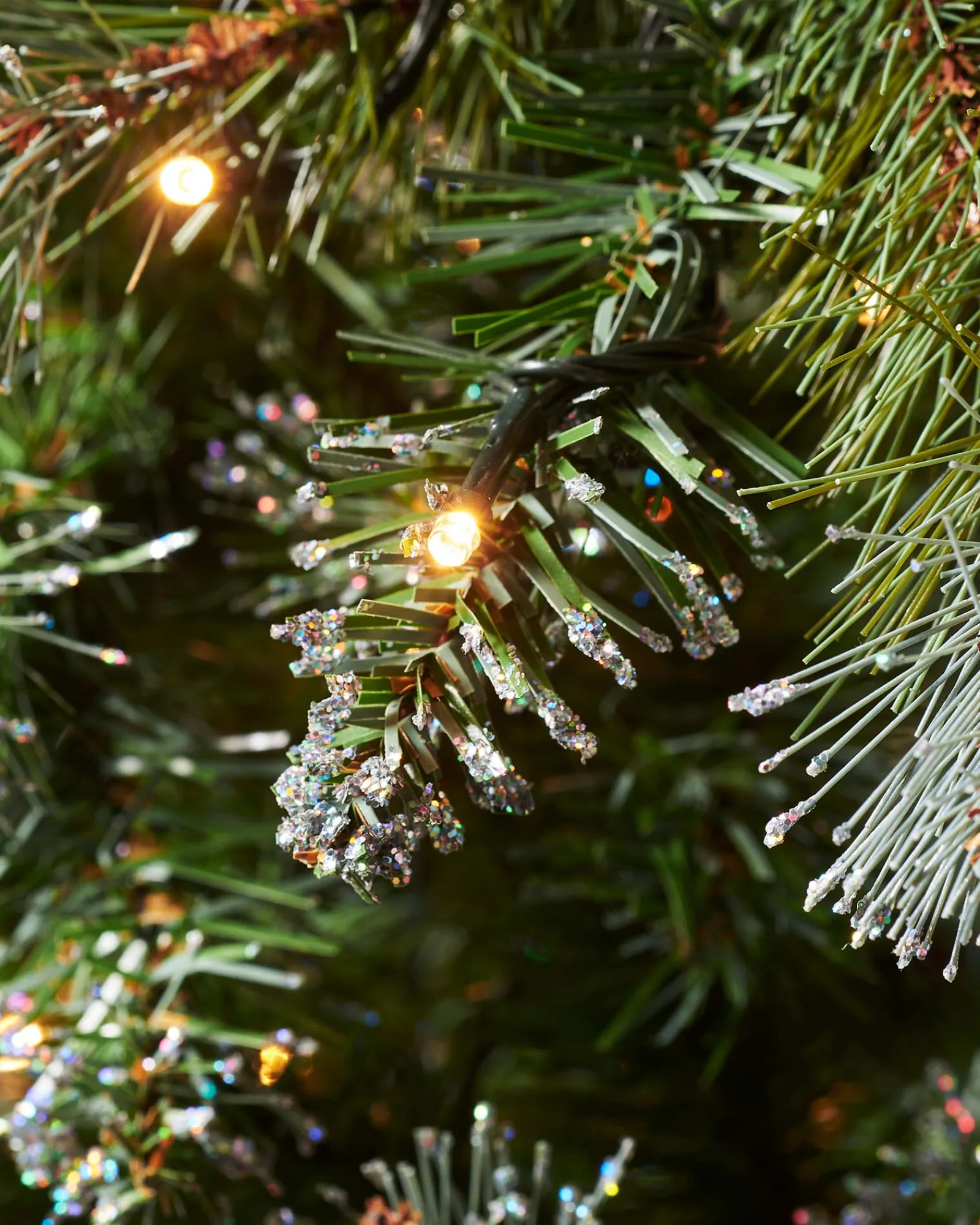 The tree’s grandeur is elevated by a shimmering array of 300 warm white LEDs, casting a soft and inviting glow. With 8 diverse multi-functional settings, it grants you the freedom to craft a lighting spectacle that mirrors your festive mood. And to add that final touch of magic, a delicate glitter finish dances along the branches, reflecting light in a myriad of sparkling patterns.