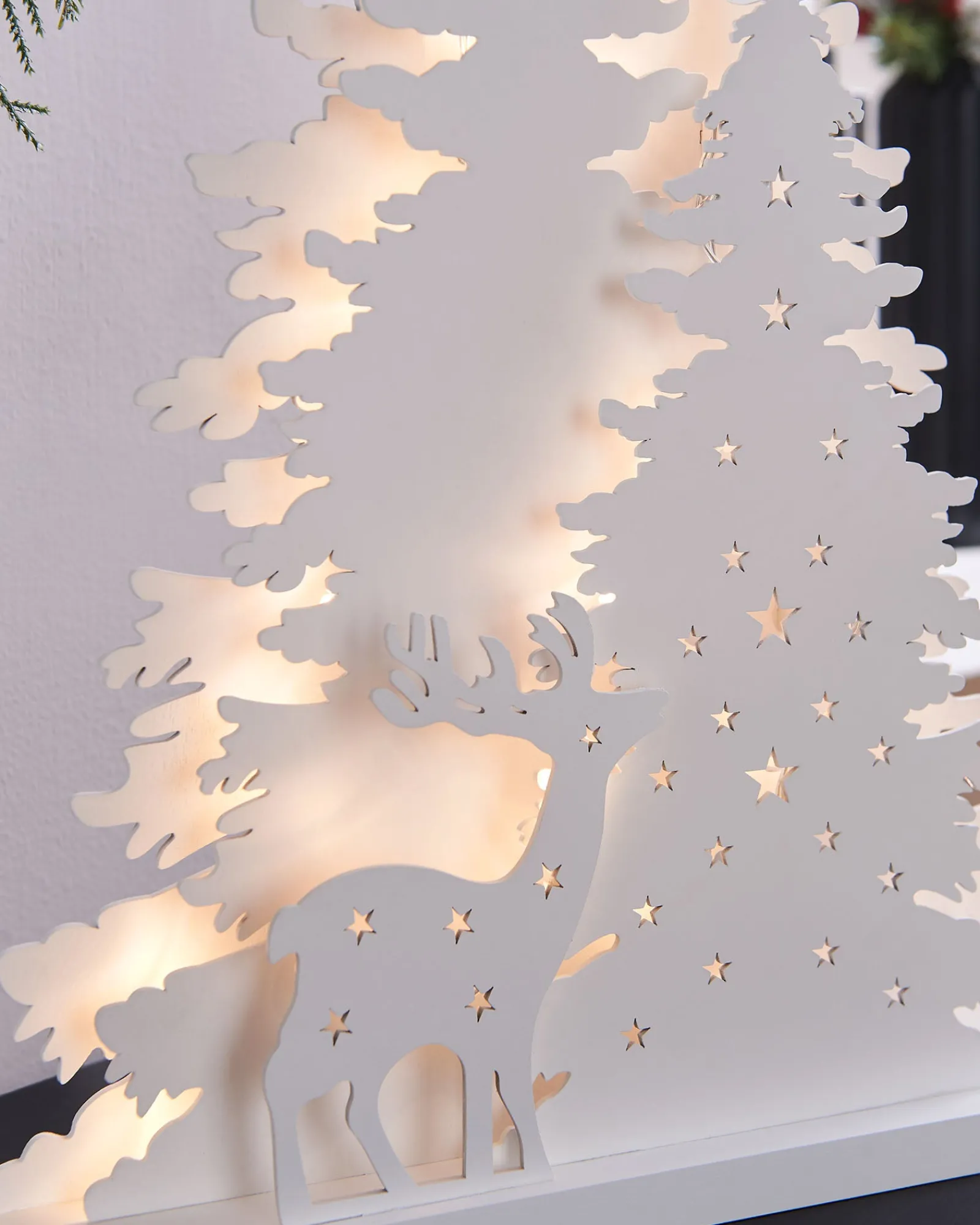 Create a warm and inviting atmosphere in your home this festive season with this enchanting Pre-Lit Wooden Reindeer Scene. This beautiful scene features a reindeer standing in front of snowy trees, all pre-lit with 30 Warm White LED lights. The scene is also crafted from white painted high-quality wood, ensuring that it will last for years to come.