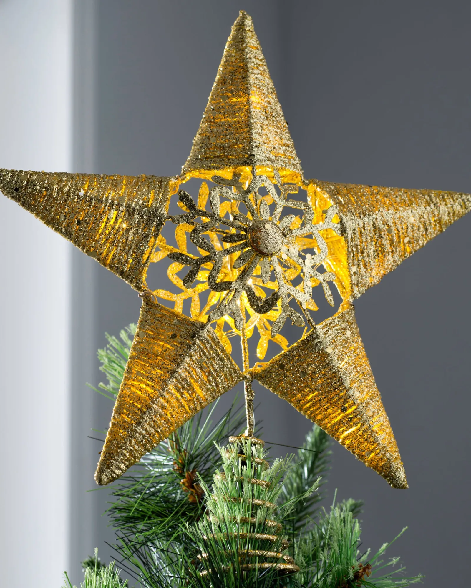 Add a touch of celestial elegance and winter wonderland magic to your Christmas decor with this stunning Pre-Lit Gold Snowflake Christmas Tree Topper. This exquisite topper features a delicate snowflake design with intricate detailing, all finished in a shimmering gold hue.